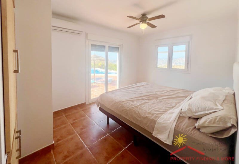 Vom Wohnzimmer aus führen zwei Torbögen zu den Schlafzimmern, die alle mit Deckenventilatoren und Klimaanlagen ausgestattet sind. Durch den ersten Bogen gelangt man in das Hauptschlafzimmer mit separatem WC und Abstellraum. Der zweite Bogen führt zu den Gästeschlafzimmern, einem Doppel- und einem Zweibettzimmer. Alle Schlafzimmer verfügen über Einbauschränke und Fenstertüren, die auf eine Terrasse hinter dem Haus führen.