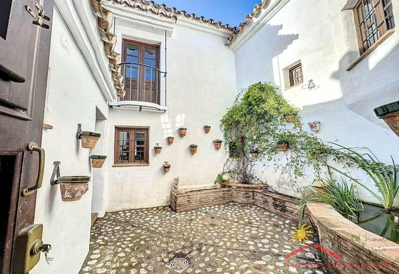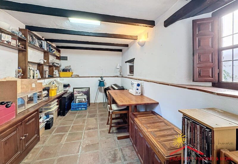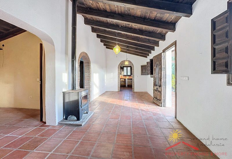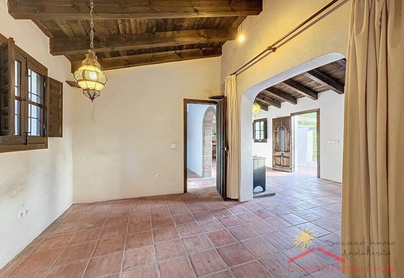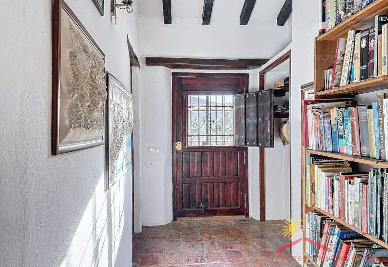 From the front terrace (2.7 x 14 m) there are two accesses into the house, we enter through the main entrance, a traditional wooden door taking you into the hallway (11m2) to the right is the office /study (2.50 x 3.20m) at the end of the hallway there are double doors giving access to the central patio (4 x 3.60 m).
