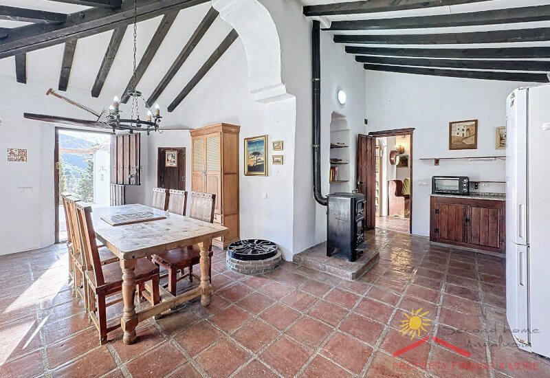 Crossing the hallway, a door takes you into the spacious traditional country kitchen/diner (30.35m2) with a log burner for the winter months situated where the old olive press used to be, here you will also find one of the original wells where the first pressed olive oil was stored. There is an old stable door from the kitchen taking you out onto the front terrace.