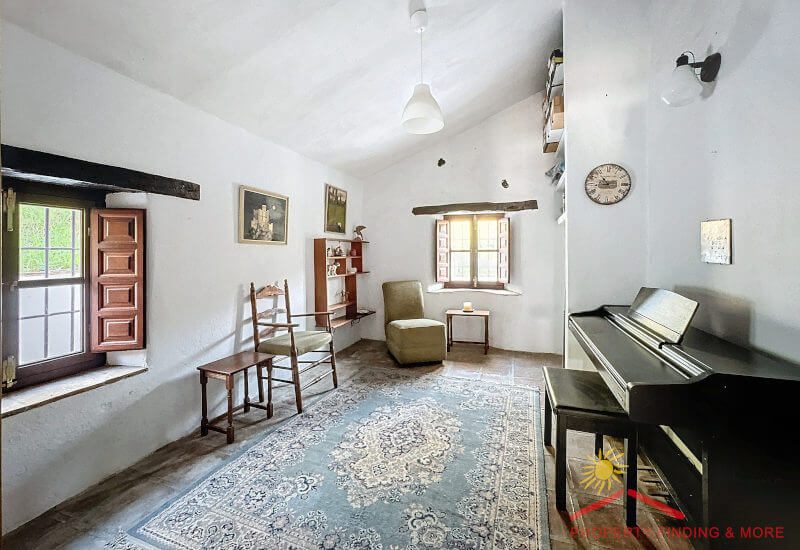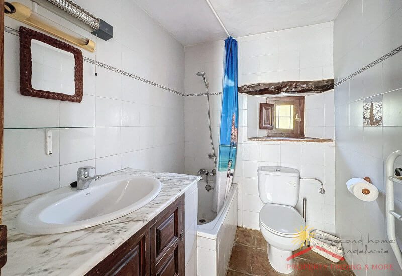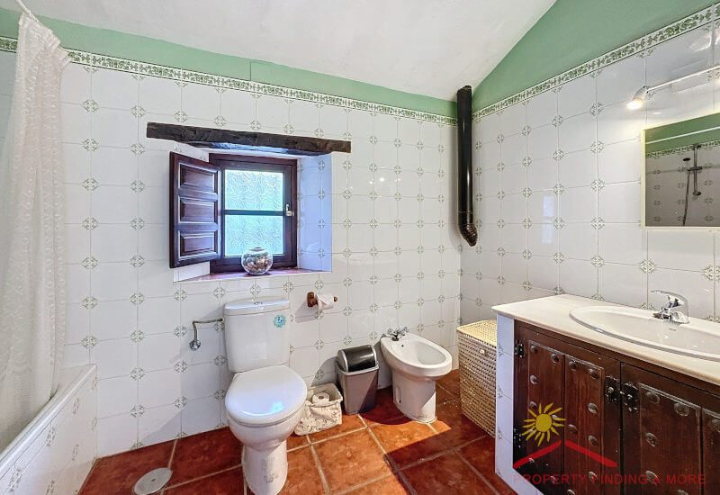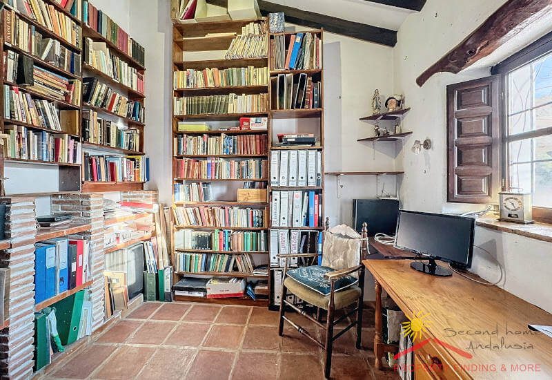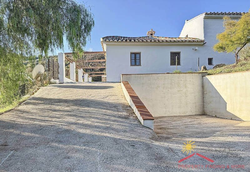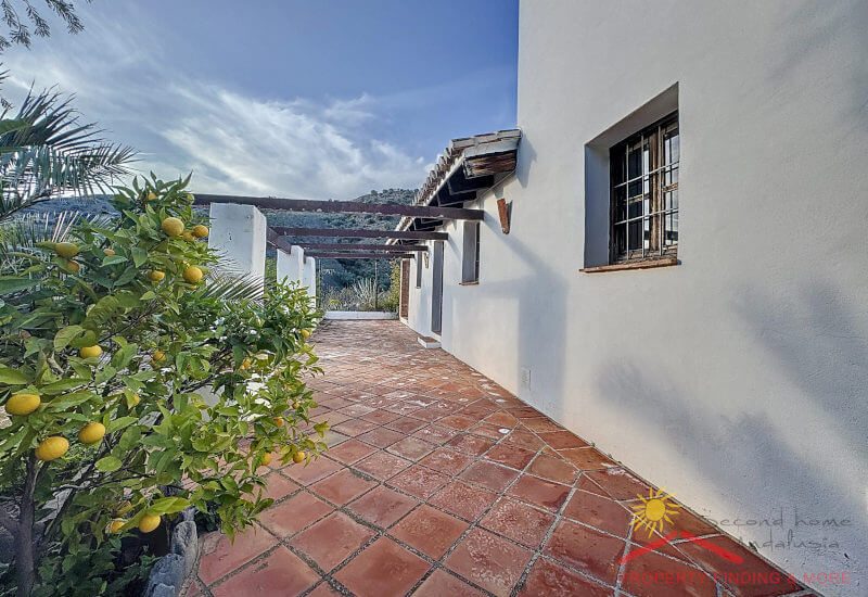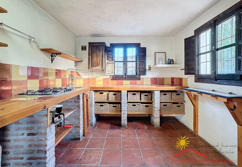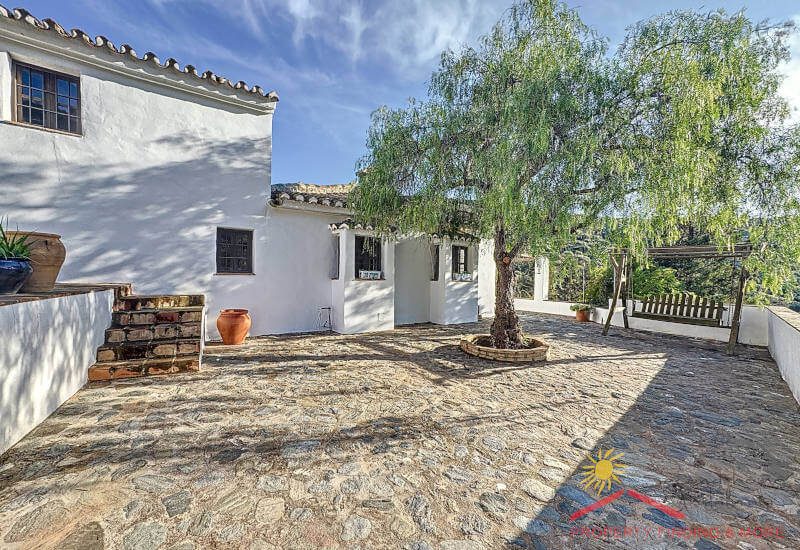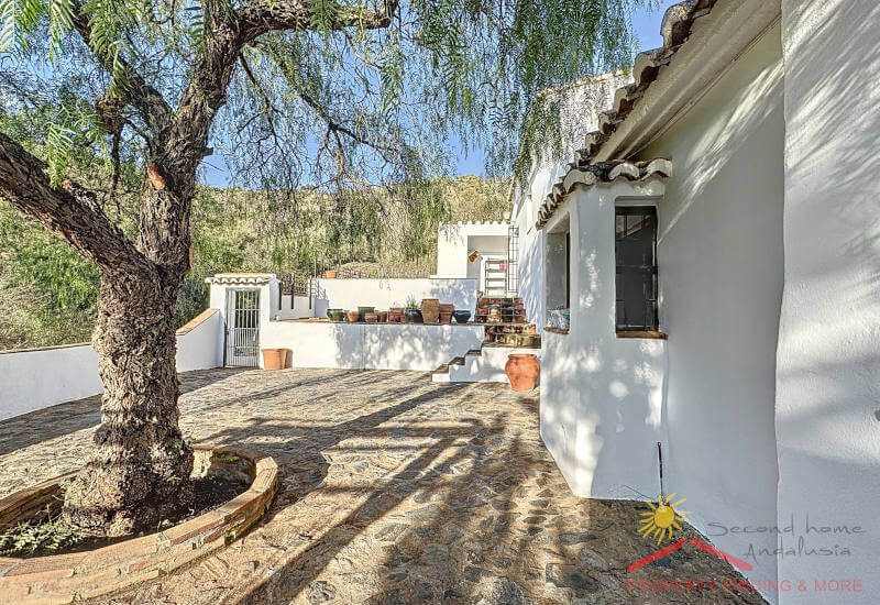 Aan de andere kant van de gang is een grote bijkeuken/berging (3,65 x 3 m) met een deur die leidt naar het zijterras (27m2) waar zich een grote houtopslag bevindt. Vanaf hier brengen enkele treden je naar een aantrekkelijke geplaveide binnenplaats (84m2) met een prachtige Falsa Pimiento (pseudo peperboom) in het midden. Dit zou een uitgelezen plek zijn voor een buitenkeuken/ BBQ eethoek.