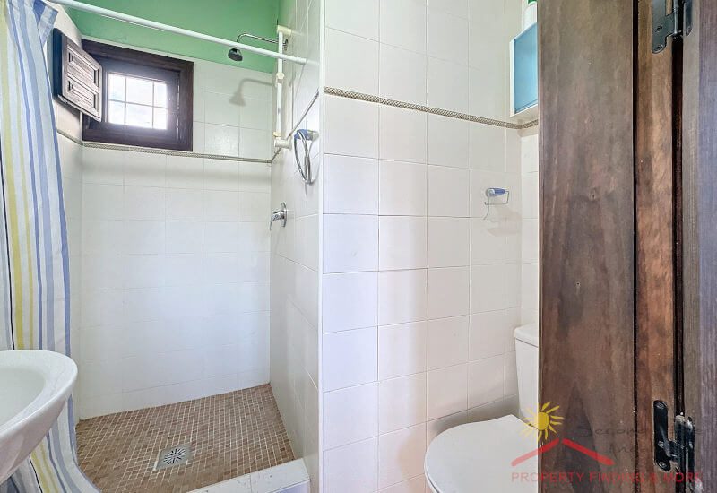 Terugkerend naar de woonkamer, loop je onder een boog door een gang in waar zich een familiebadkamer (2,90 x 1,85 m) en een slaapkamer (2,95 x 2,60 m) bevindt. Een trap brengt je naar de tweede slaapkamer (5,10 x 2,65 m) met en-suite badkamer (2,2m2).