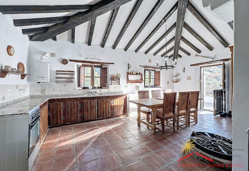 Als je de gang oversteekt, brengt een deur je naar de ruime traditionele landelijke keuken/ eetkamer (30,35m2) met een houtkachel voor de wintermaanden op de plaats waar vroeger de oude olijfpers stond. Hier vind je ook een van de originele putten waar de eerste geperste olijfolie werd opgeslagen. Er is een oude staldeur vanuit de keuken die je naar het terras aan de voorzijde brengt.