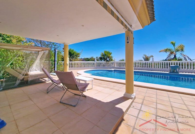 De oprit biedt ook toegang tot het voorterras en de overdekte veranda. Van hieruit leiden trappen naar het grote verwarmde zwembad (15 x 5m) met zoutwater en het terras met een fraaie pergola (4 x 4m) en een houten Bali-bed. Het zwembad heeft een elektrische zonne-cover en een speciale duikzone waar het 2,5 meter diep is. Er is ook een buitendouche op zonne-energie.