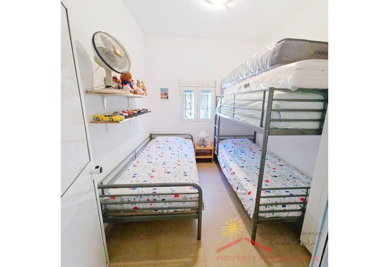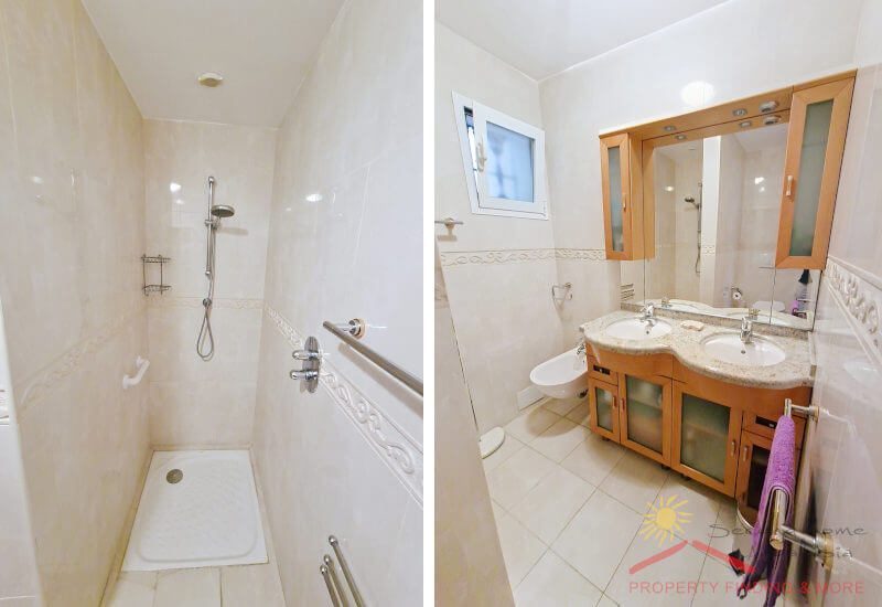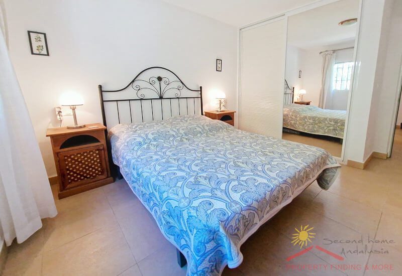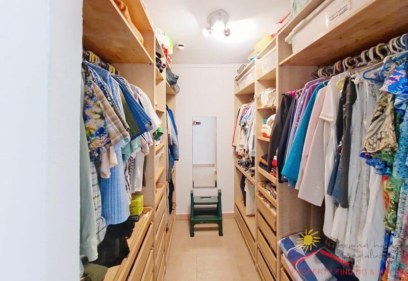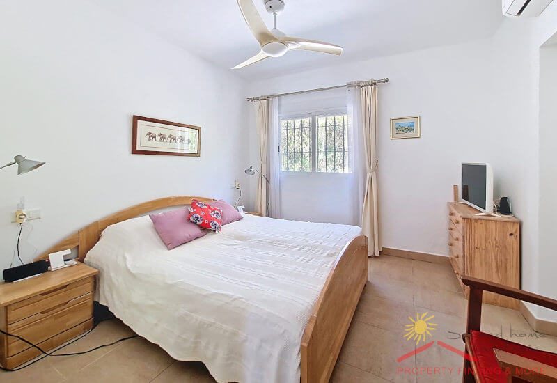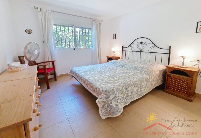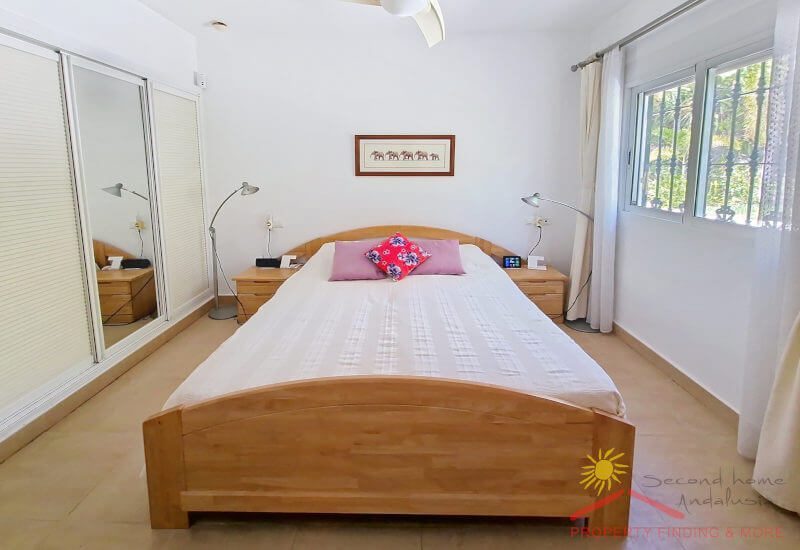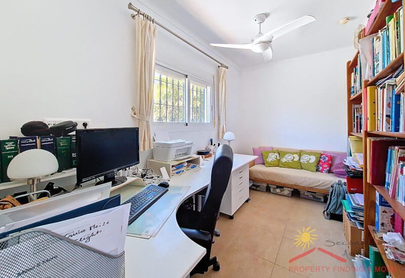 De 4e slaapkamer (2,05 x 3,90m, nu in gebruik als kantoor) grenst aan de woonkamer. De hoofdslaapkamer is bereikbaar via de woonkamer en een kleine hal met aan de rechterzijde de inloopkast (2,60 x 2,15 m), de slaapkamer met plafondventilator, airco en nog een inbouwkast (3,55 x 6,90m), en de ensuite badkamer met bubbelbad en aparte douche (2x 6,90m).