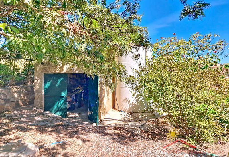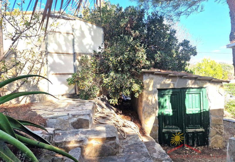 Achter het huis bevindt zich een schaduwrijke zithoek, evenals enkele bijgebouwen, een werkplaats, kassen en drie watertanks van elk 10.000 liter. Er is ook een carport met laadpunt voor elektrische auto’s.