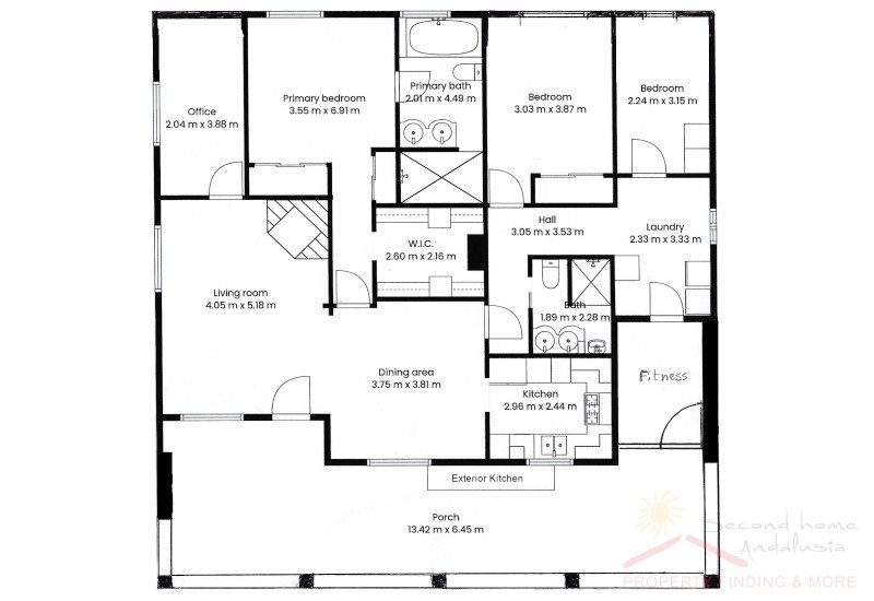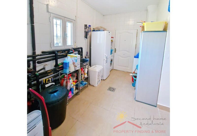 Een andere hal leidt naar de bijkeuken (2,33 x 3,33m), met wasmachine, droger en het zonnestroomsysteem. Vanuit de bijkeuken is er toegang tot een handige opslagruimte (2,33 x 3,33m), die eenvoudig kan worden omgebouwd tot een extra kamer, en van daaruit terug naar de overdekte veranda.
