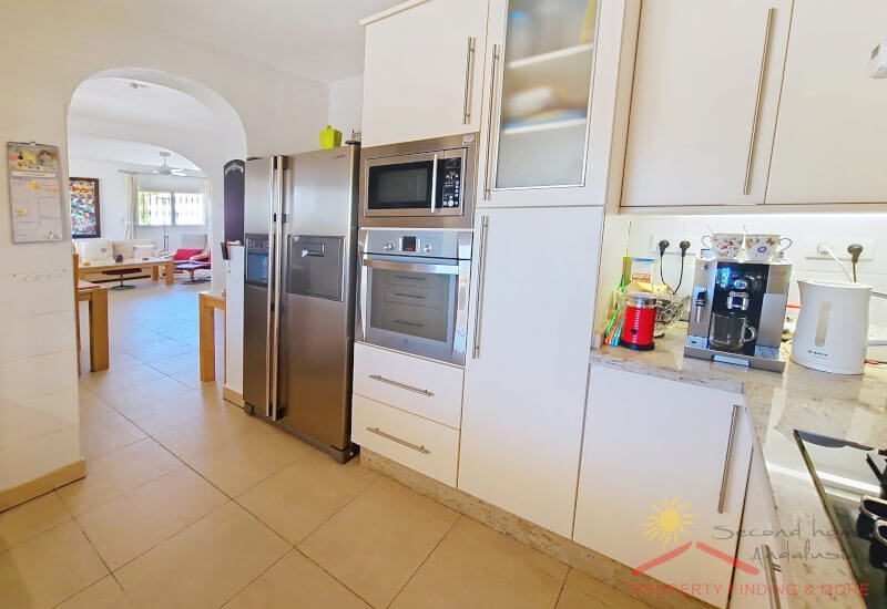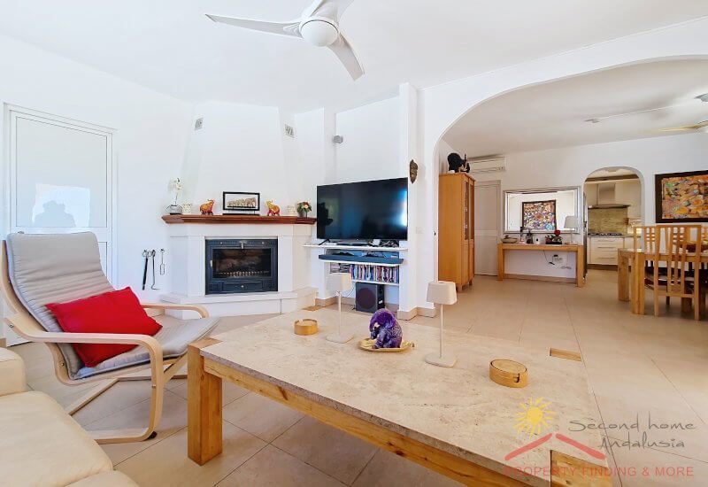 Vanaf het voorterras (ca. 14 x 4,50m) kom je via de voordeur in de open woonkamer (4,05 x 5,10m) en eetkamer (3,75 x 3,82m) met plafondventilatoren, houtkachel en airconditioning. De volledig ingerichte keuken (3 x 2,45m) ligt naast de eetkamer en biedt een mooi uitzicht op de tuinen en de zee.
